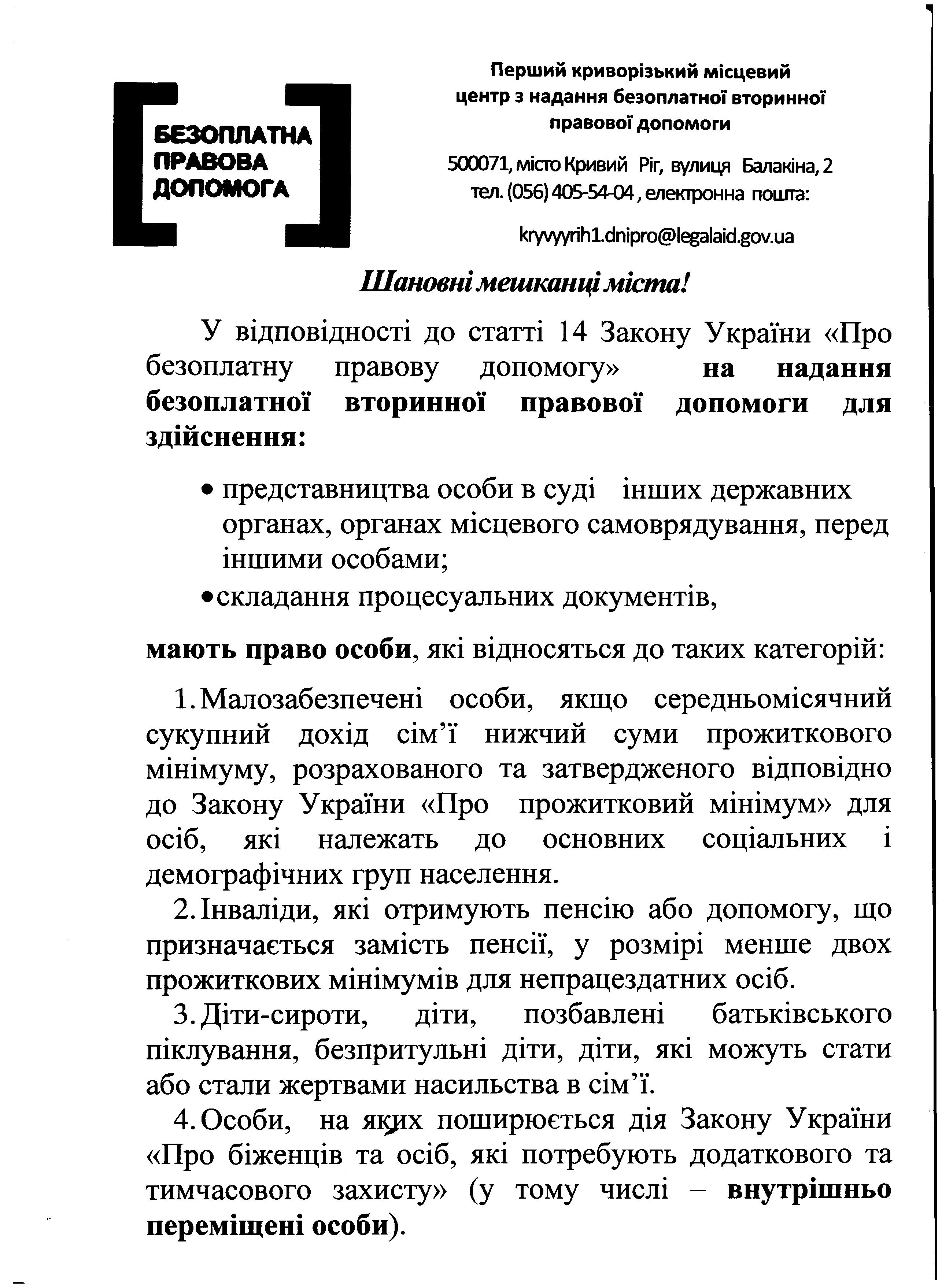 З 1 липня 2015 року почали роботу місцеві центри з надання безоплатної вторинної правової допомоги. На території міста Кривого Рогу працюють Перший і Другий криворізькі центри з надання безоплатної вторинної правової допомоги